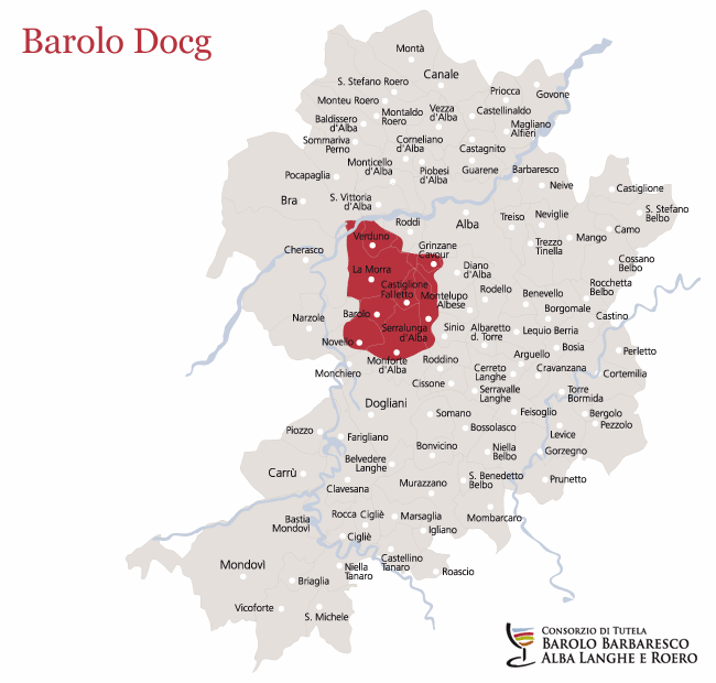 Obszar produkcji rozpościera się na wzgórza 11 miast: Barolo, Castiglione Falletto, Serralunga d'Alba, Cherasco, Diano d'Alba, Grinzane Cavour, La Morra, Monforte d'Alba, Novello, Roddi, Verduno, wszystkie w prowincji Cuneo, południowo- zachodniej części obszaru Alba (włoskiego miasta słynącego z rzadko występujących I drogich białych trufli.) Cały obszar nosi nazwę Langhe i jest również znany z produkcji innego wspaniałego wina Barbaresco ( które jest nazywane młodszym bratem Barolo), również wytwarzane z 100% winogron Nebbiolo.